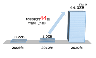 AIやIoT等の普及により、人間を含めた現実社会に存在するあらゆるものの形状や動作がセンサーにより自動的にデジタルデータ化することが可能になると予想されています。2020年に生成されるデジタルデータ量は、2010年の約44倍まで増加する見通しです。
